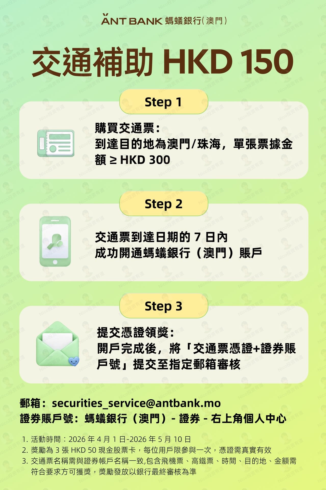 另外,目前去澳门开户的话,如果交通费大于 300 港币,在 7 天内还可以找澳门蚂蚁领取 150 港币现金卡的补贴。