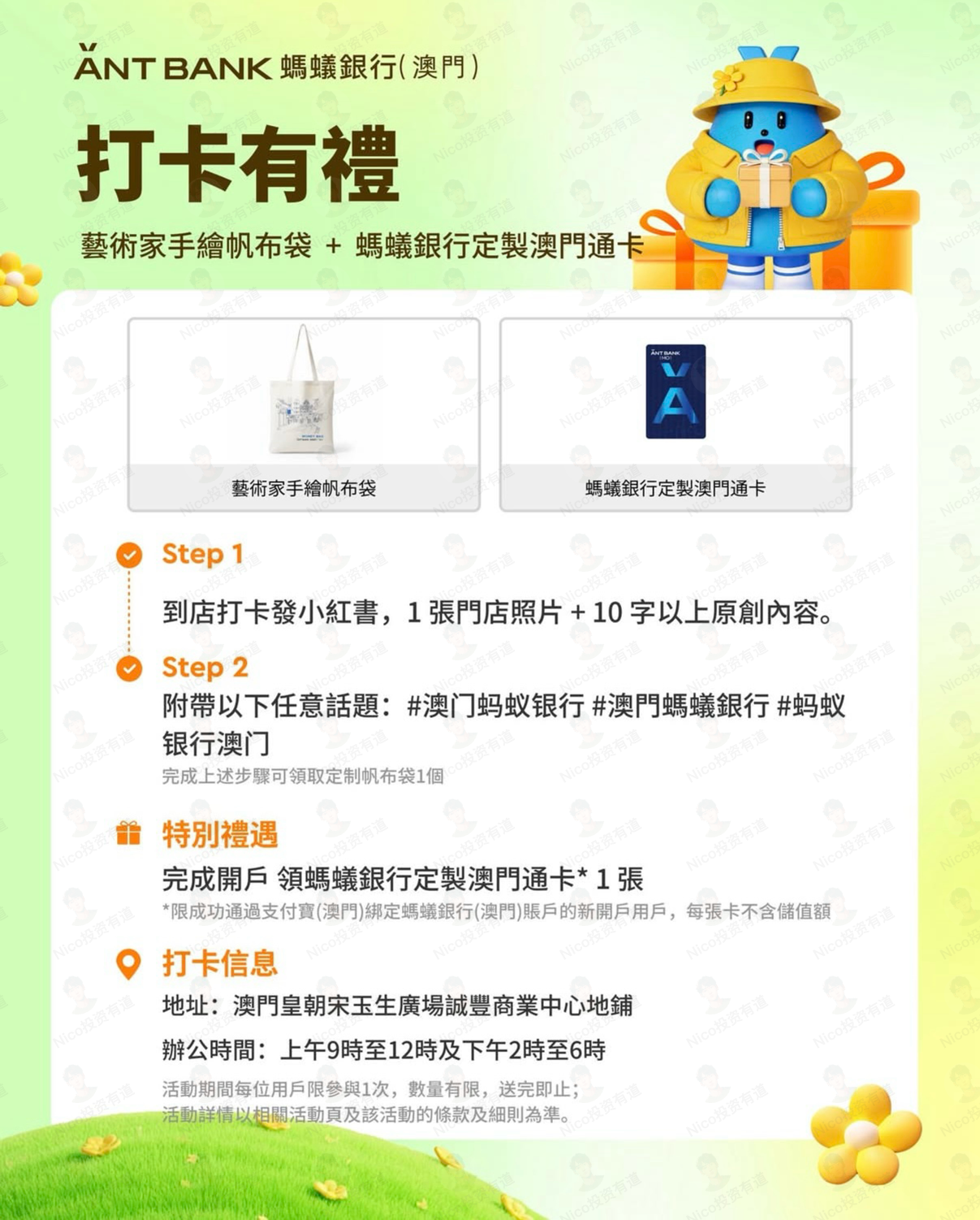 开户成功之后,如果有时间的话,可以到澳门蚂蚁的线下网点打卡一下,可以领到一个帆布包和一张蚂蚁银行定制的澳门通卡。