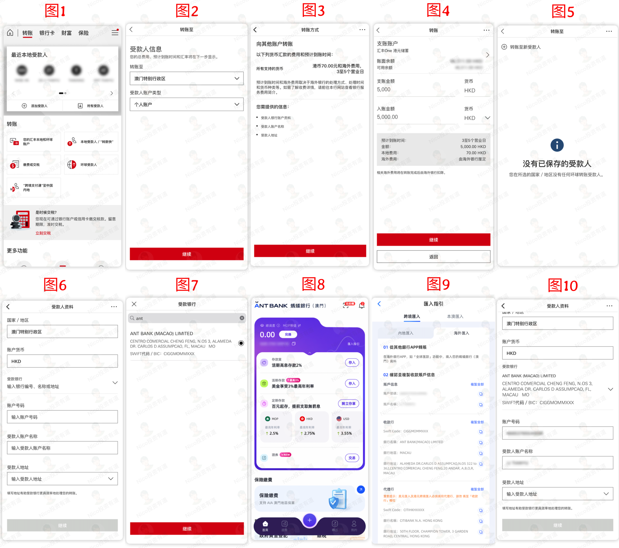 如图 8/9 所示,关于账户号码、账号名称和地址这几行信息,直接打开澳门蚂蚁 App,在首页点击汇入指引,选择海外汇入,就可以看到相关的信息了,复制粘贴到香港汇丰 App 中。