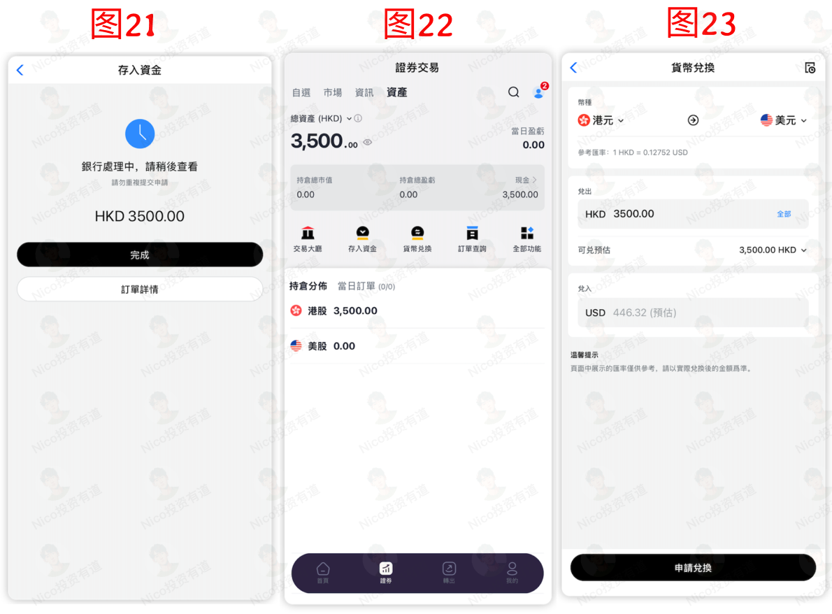如图 22/23 所示,回到资产界面,点击货币兑换,把港币换成美元,这样就可以去购买交易美股了。