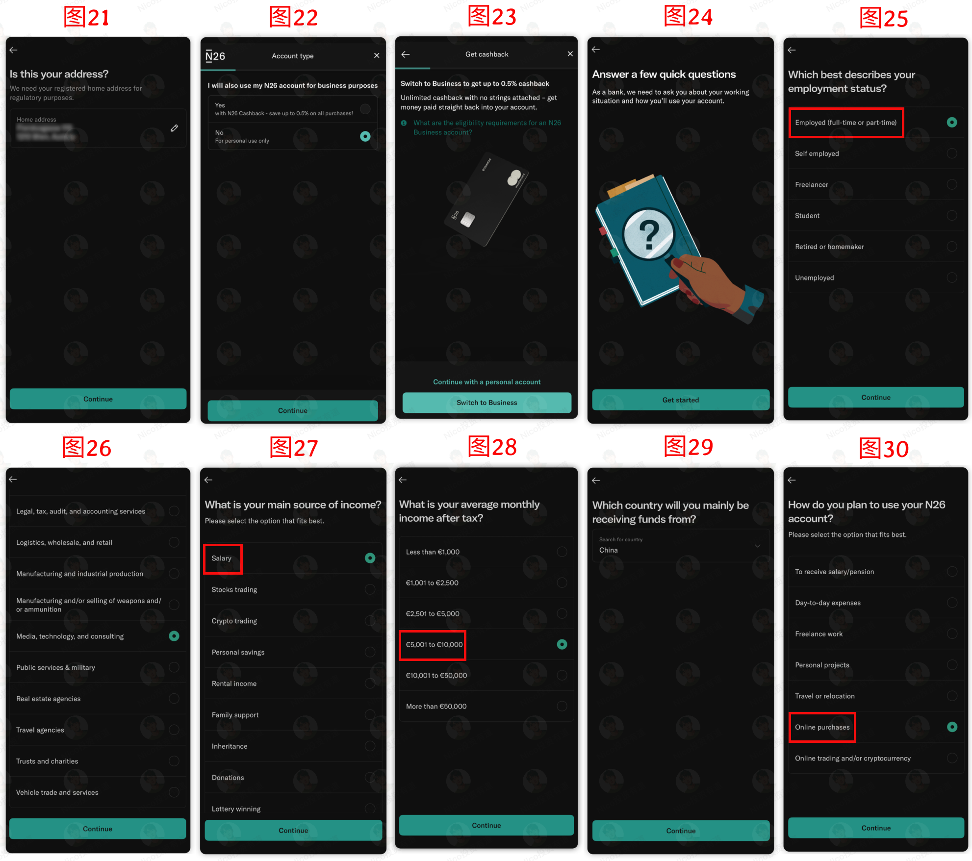 就业状态选 Employed,职业岗位据实选择,收入来源选 Salary,月税后收入选 5,000-10,000 欧元,接受汇款国家选中国,使用用途选 Online purchase。