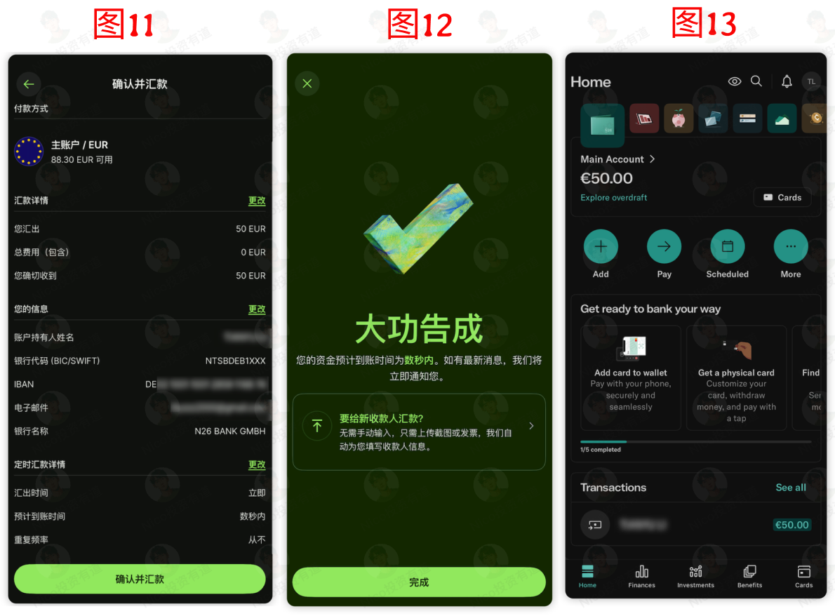 如图 13 所示,基本上同一时间,我的 N26 账户就收到了这 50 欧元的汇款,因为是欧元区内的 SEPA 汇款体系,到账速度非常快。