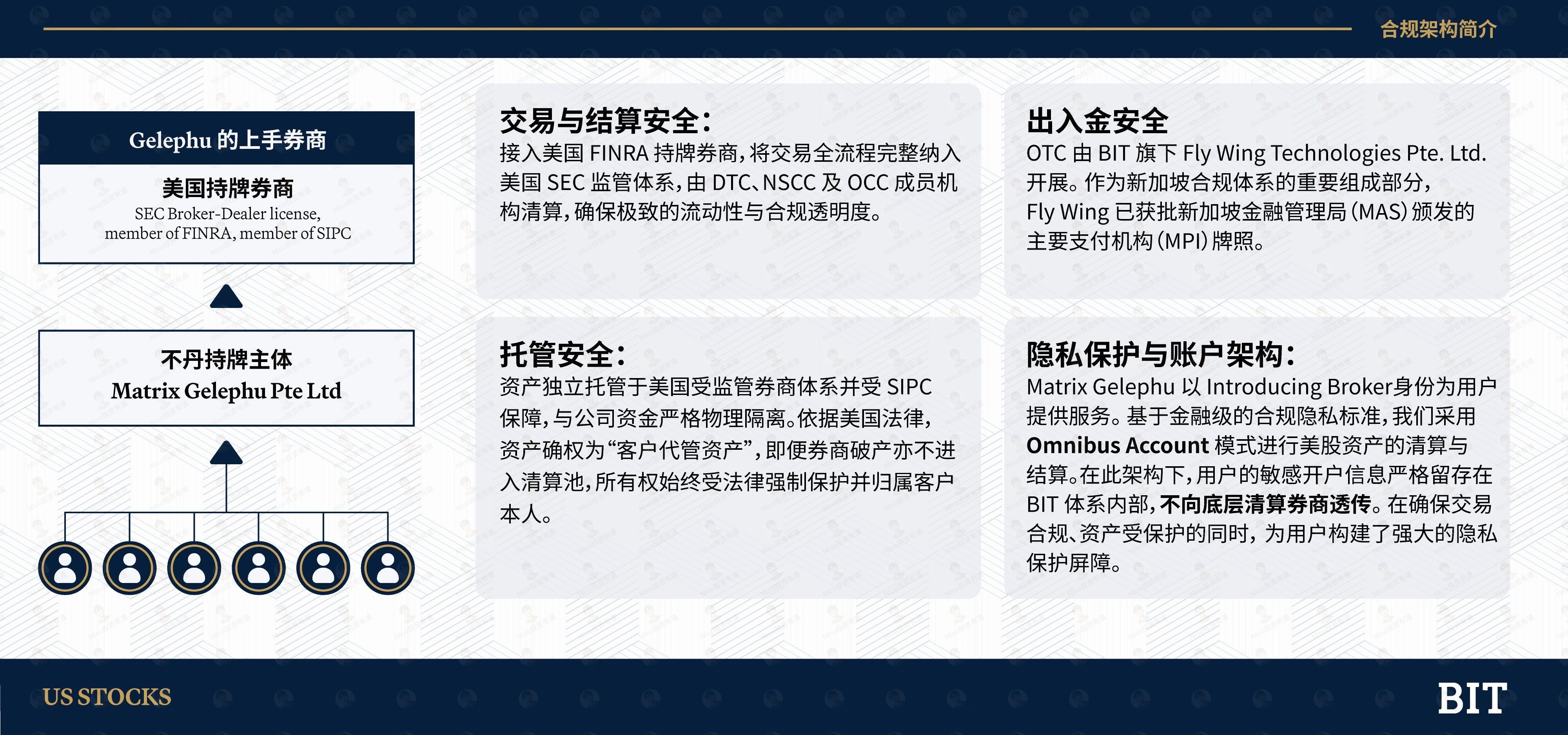 BIT的美股业务由自有的持牌主体MatrixGelephu Pte Ltd支持,再由美国的持牌上手券商提供清算与托管,