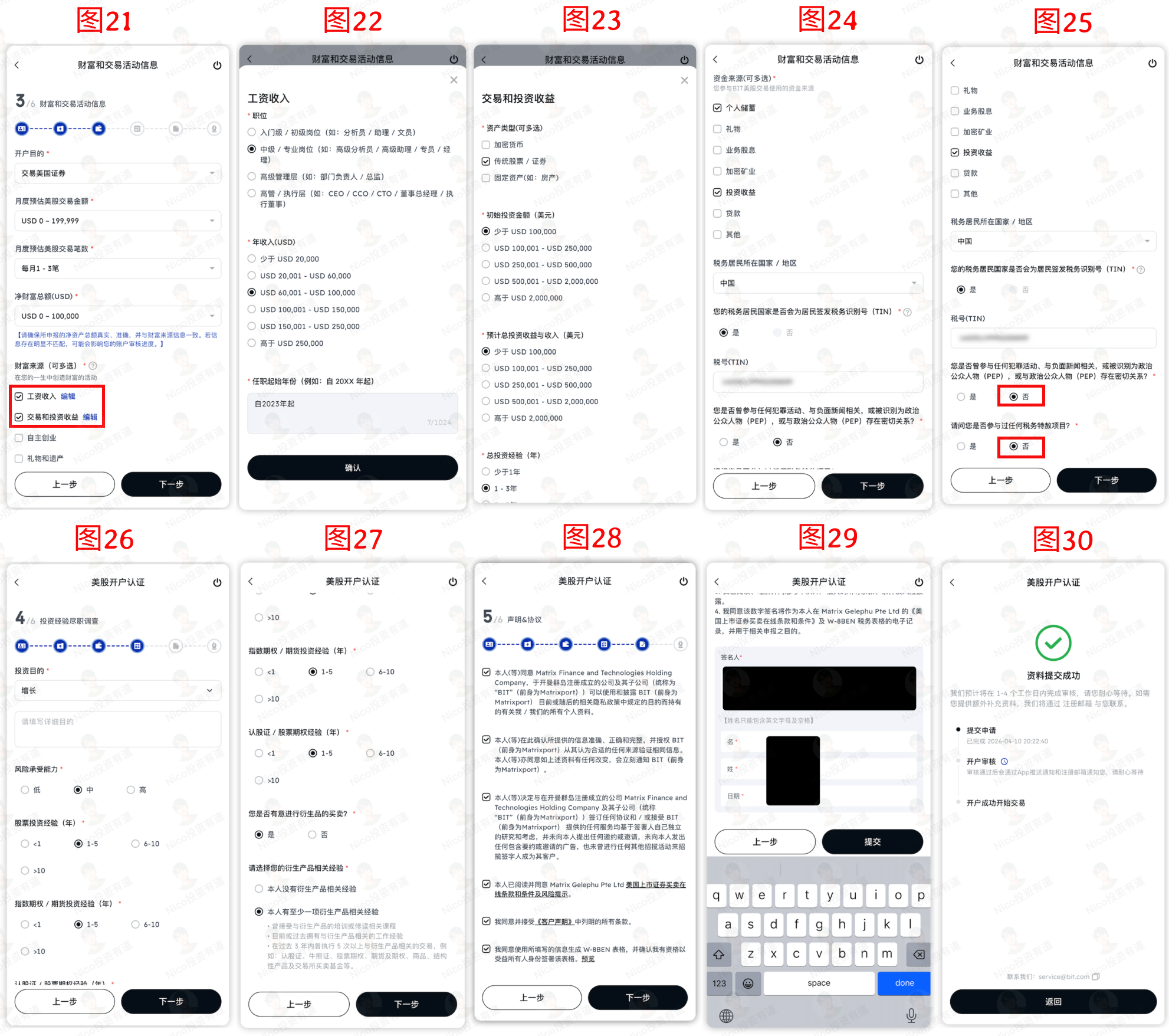 如图 21/22/23/24/25 所示,填写一下财富和交易活动信息。