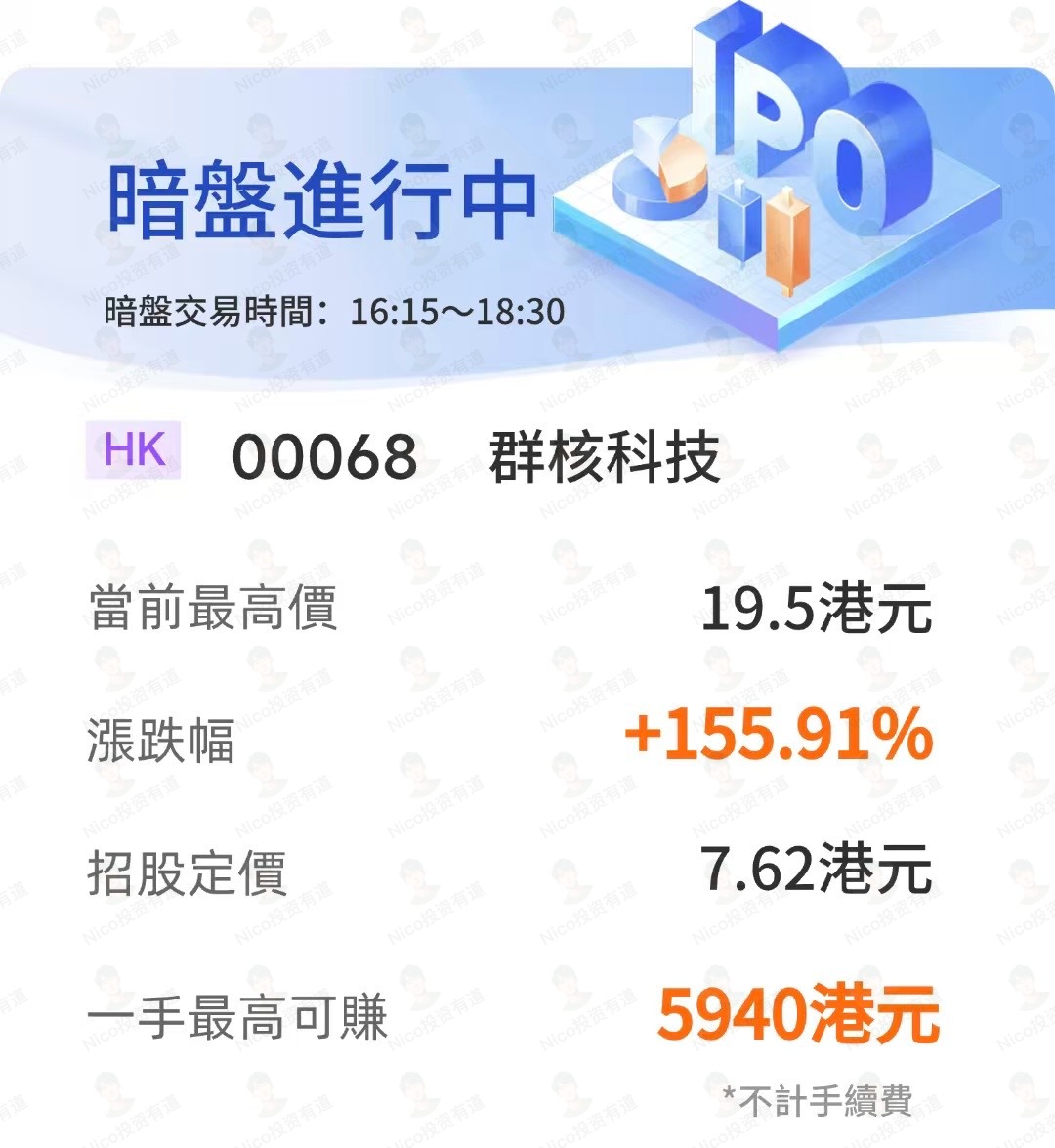 有一个名字叫群核科技的港股,还未正式交易,暗盘就翻了接近 3 倍,只要认购中一手,最高可以赚到 6000 港币。
