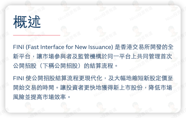 港交所在 2023 年 11 月 22 日正式推出 FINI,也就是新股结算平台。把新股从定价到正式交易的时间从 T+5 缩短到 T+2。